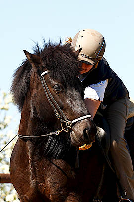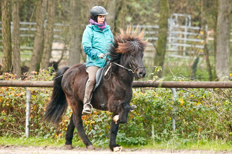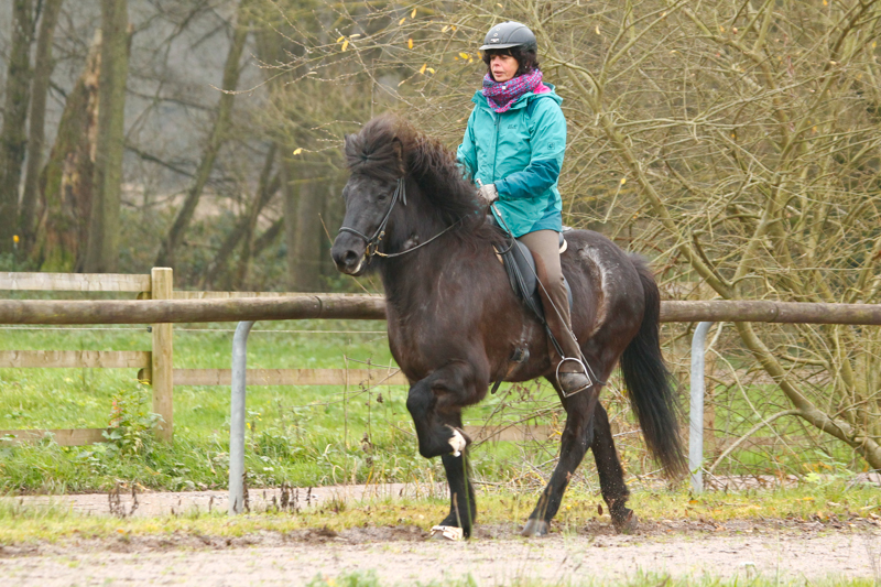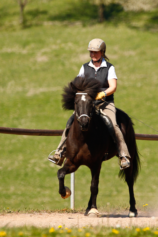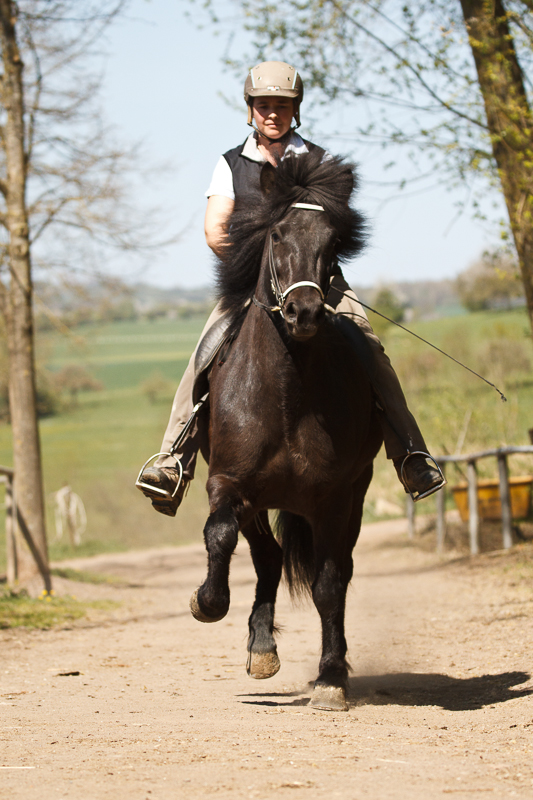 Die erste stelle ich Euch gleich mal vor: Kaeppa vom Gestüt Ponsheimerhof, eine sehr große und kräftige Rappstute von Hervar vom Kramersbruch. Kaeppa ist ganz lieb und leichtrittig, obwohl sie erst fünf Jahre alt ist. Sie hat unheimlich viel natürlichen, taktklaren Tölt und schon jetzt eine imposante Form unter dem Reiter. Der Trab ist weit und locker, der Galopp raumgreifend und sehr bequem. Kaeppa ist ein tolles Pferd für einen Reiter, der eine lockere, schicke Tölterin sucht.