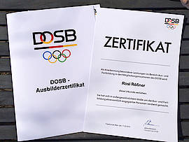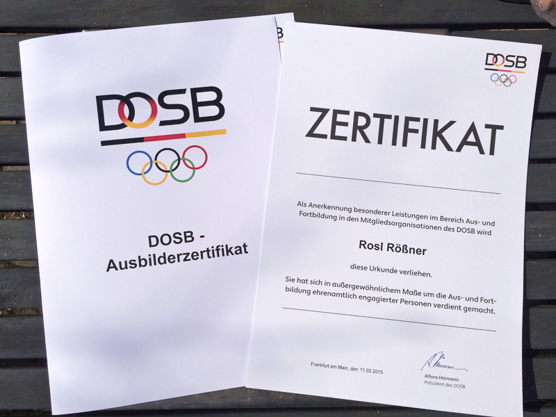 Im Februar habe ich meine Fortbildungen bei der FN / dem DOKR (Deutsches Olympisches Komitee für Reiterei) abgeschlossen. Heute erhielt ich mein "DOSB Ausbilderzertifikat". Damit habe ich eine Zusatzausbildung, die momentan nur etwa 15 Ausbilder im gesamten Reit- und Fahrsport durchlaufen haben. Die Inhalte dieser Lehrgänge beziehen sich auf die Ausbildung von Reitern, insbesondere von Trainern, und behandeln Themen wie Sozial- und Methodenkompetenz, Konfliktlösungsstrategien, Lehr- und Lernverhalten oder Gesprächsführung. Die Fortbildung hat mir viel Spaß gemacht und mir viele neue Ideen vermittelt :-)