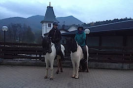 Es war grade noch hell genug für einen letzten Ritt ins Gelände. Die beiden Scheckdamen sind Lola und ihre "Nichte" List, die mittlerweile schon angeritten ist und richtig viel Spaß macht.