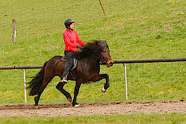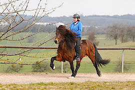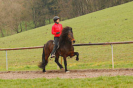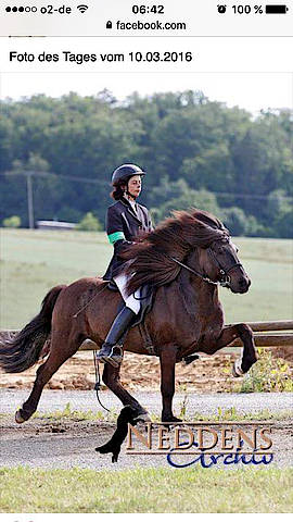 Umständehalber ist der wunderschöne, braune Fünfganghengst Keilir, den ich seit einigen Monaten zur Ausbildung bei mir habe, abzugeben. Keilir hat fünf gleichmäßig starke Gänge und ist sehr leicht zureiten. Er hat eine tolle Abstammung, ein sehr elegantes Gebäude und er war bereits Siegerhengst bei der Jungpferdematerialprüfung. Keilir müsste nicht zwangsläufig Hengst bleiben, er wäre auch als Wallach ein toller Fünfgänger für den Sport- oder Trainerbereich. Sein sicherer, leicht zu reitender Pass macht ihn hoch interessant für einen Reiter, der Erfahrung im Rennpassreiten sammeln möchte oder für einen Reiter, der die Trainer B oder A- Prüfung anstrebt.